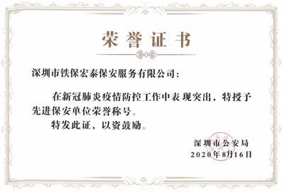 熱烈祝賀我司鐵保宏泰保安榮獲疫情防控工作“先進(jìn)保安單位”稱號(hào)
