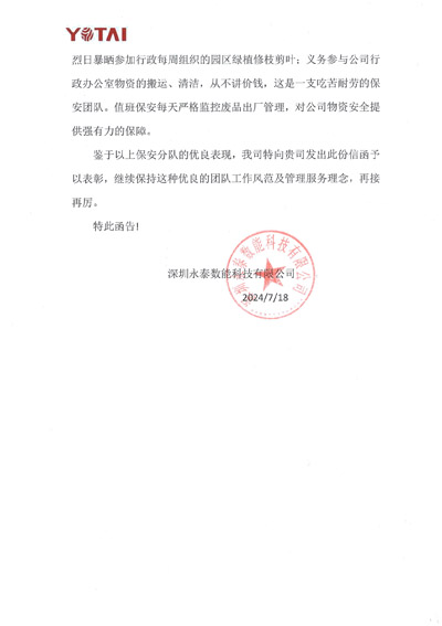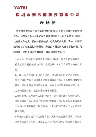 深圳永泰數(shù)能科技公司致信表揚我司鐵保宏泰保安