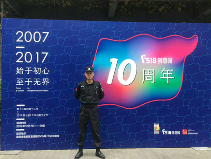 深圳F518時(shí)尚創(chuàng)意園是深圳市和寶安區(qū)“十一五”規(guī)劃的重點(diǎn)文化產(chǎn)業(yè)項(xiàng)目,園區(qū)位于寶安中心區(qū)的核心地帶。2007-2017 始于初心 至于無界。我司鐵保宏泰保安參與慶典安全護(hù)衛(wèi)。