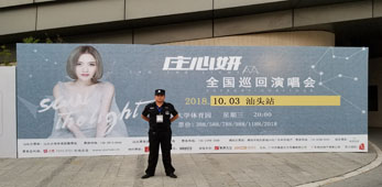 2018莊心妍Saw The Light 全國(guó)巡回演唱會(huì)-汕頭站,超強(qiáng)配置,巔峰呈獻(xiàn),帶您領(lǐng)略酣暢淋漓的視聽體驗(yàn),合唱難忘的經(jīng)典情歌,共享一場(chǎng)非凡的音樂盛宴。10月3日,汕頭大學(xué)體育館隆重舉行。我司派駐安保人員110人參加護(hù)衛(wèi)活動(dòng)。