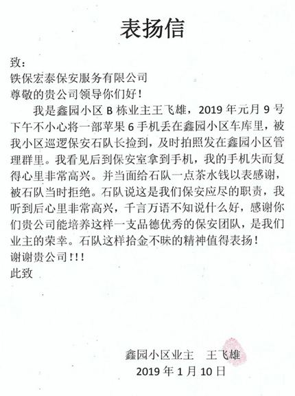 我是鑫園小區(qū)B棟業(yè)主,2019年元月9號下午不小心將一部蘋果6手機丟在鑫園小區(qū)車庫里,被我小區(qū)巡邏保安石隊長撿到,及時拍照發(fā)在鑫園小區(qū)管理群里。我看見后到保安室拿到手機,我的手機失而復(fù)得心里非常高興。并當(dāng)面給石隊一點茶水錢以表感謝,被石隊當(dāng)時拒絕。石隊說這是我們保安應(yīng)盡的職責(zé),我聽到后心里非常高興,千言萬語不知說什么好,感謝你們貴公司能培養(yǎng)這樣一支品德優(yōu)秀的保安團隊,是我們業(yè)主的榮幸。石隊這樣拾金不昧的精神值得表揚!