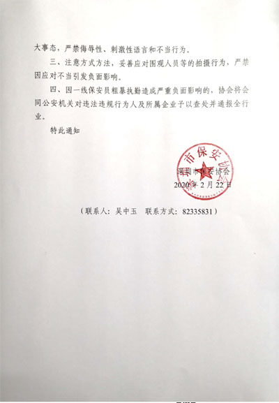 自抗擊新冠病毒疫情以來,根據(jù)省內外媒體近期一些報道,個別保安員在防疫一線工作中存在不同程度的暴力值崗執(zhí)勤現(xiàn)象,嚴重損害了保安隊伍形象,同時在社會上造成嚴重的負面影響。為此,根據(jù)各級領導指示,協(xié)會有必要進一步規(guī)范防疫期間一線保安員崗位的執(zhí)勤紀律,避免防疫行動中出現(xiàn)背離法治、文明精神、社會公德的粗暴行為,以及這些行為所引發(fā)的不良社會影響?,F(xiàn)將保安員防疫文明值崗執(zhí)勤要求通知如下: